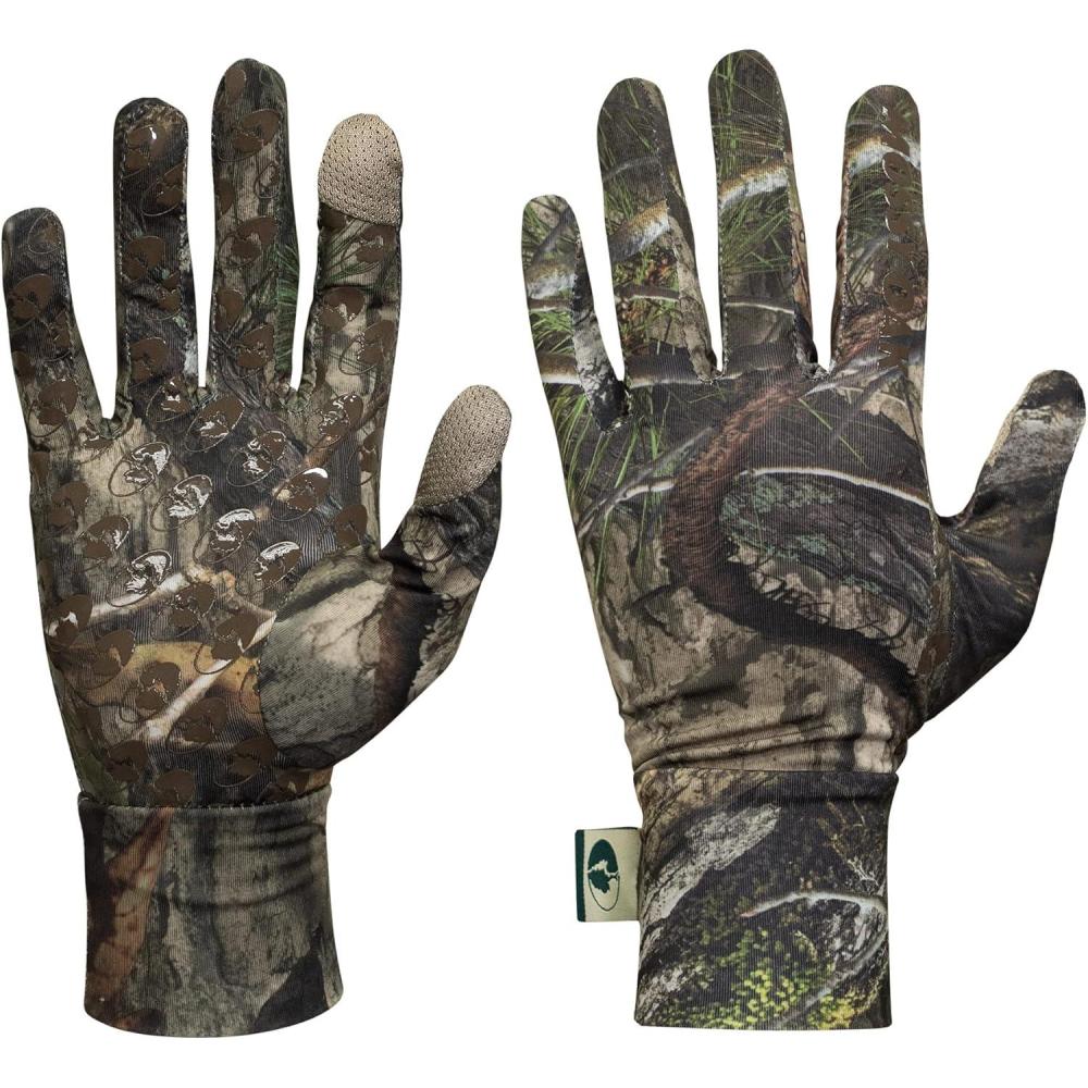 DESIGN: These camo hunting gloves are made with a 90% polyester/10% spandex blended 4-way stretch material, with an extended cuff and rubber palm that's ultra tacky for a non-slip grip on your bow, gun or other gear – Powered by Hydroplex Technology COMFORT The stretch material provides a comfortable, exact fit for full dexterity with the feel of thin hunting gloves while remaining durable. BREATHABLE & DURABLE: The lightweight material and mesh inner thumb provides the breathability necessary for warm weather hunts, while the solid construction maintains lasting durability. VERSATILITY Ideal for warm weather hunts during turkey, deer, and big game seasons. They make the perfect archery hunting gloves and double as a layering glove in colder weather. MOSSY OAK CAMO These gloves are available in a variety of camo patterns such as Break-Up Country, Obsession, Bottomland, or Vintage camo patterns like Original Bottomland, Greenleaf, and Original Treestand.