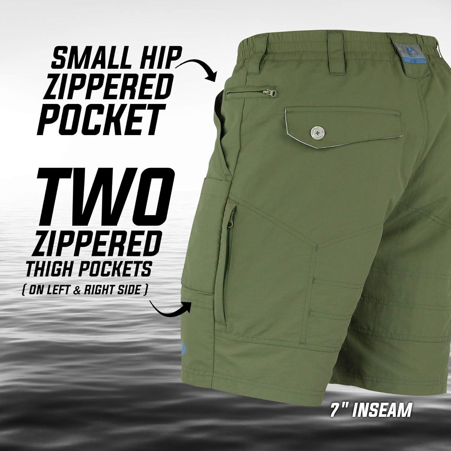 COMFORT These fishing shorts for men are made from durable, 92% Nylon/8% Spandex Blend material that's lightweight with a comfort fit elastic waistband. FAST DRYING The lightweight and breathable fabric dries water fast to keep you comfortable and dry while fishing and enjoying your favorite outdoor adventures. MULTI-PURPOSE Ideal short for inshore/offshore freshwater & saltwater fishing – also works great for camping, hiking, travel, casual wear, or as swim trunks. POCKET STORAGE Features ample storage for all of your gear with two slash hand pockets, two rear buttoned pockets, one right cargo pocket with hook and loop tape closure, dual right leg pockets with drain holes, two zippered thigh pockets on left and right side, & one small hip zippered pocket
