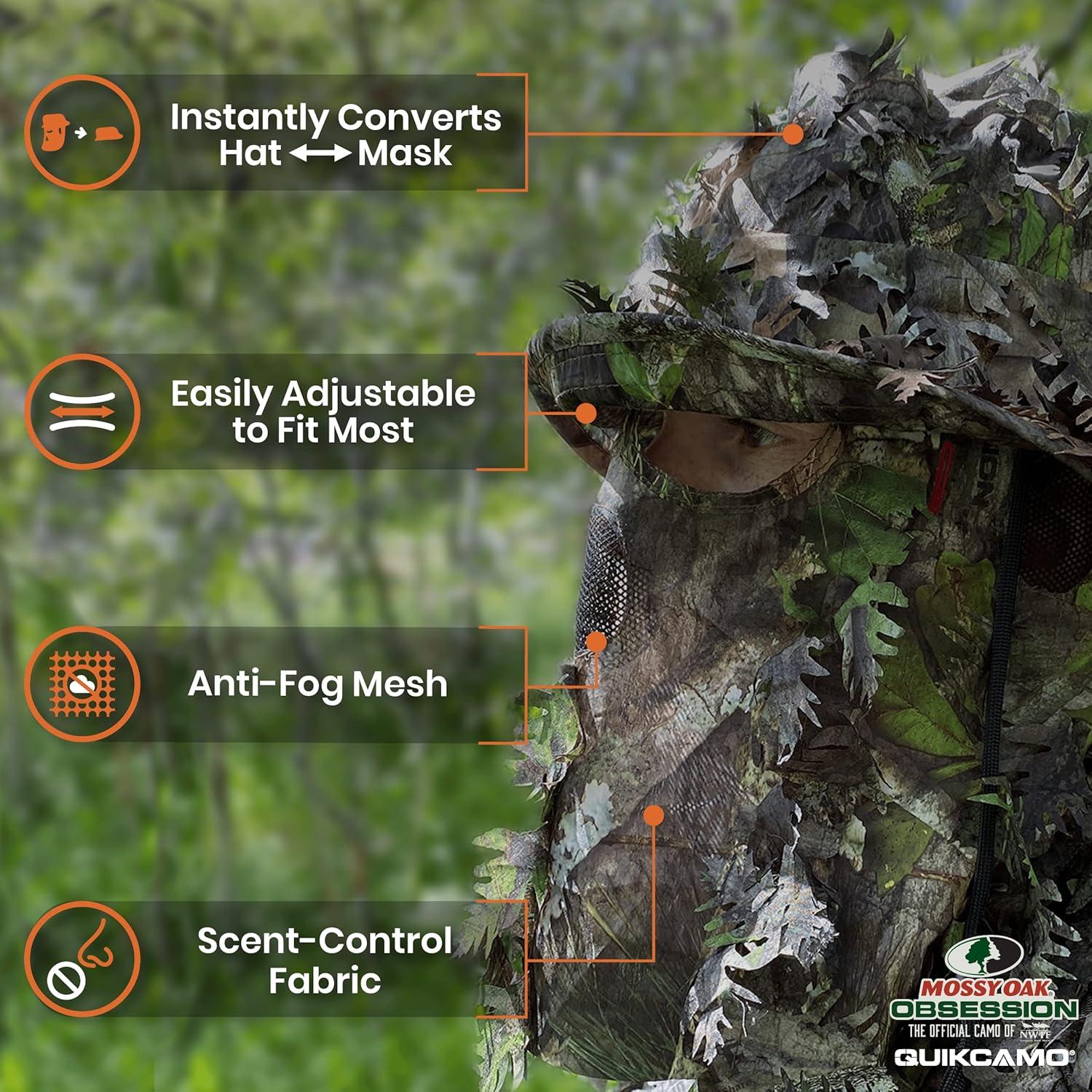QuikCamo Realtree & Mossy Oak 3D Leafy Camo Face Mask Bucket Hat for Men Deer Duck and Turkey Hunting (Fully Adjustable OSFM)(Nwtf Mossy Oak Obsession Camo)