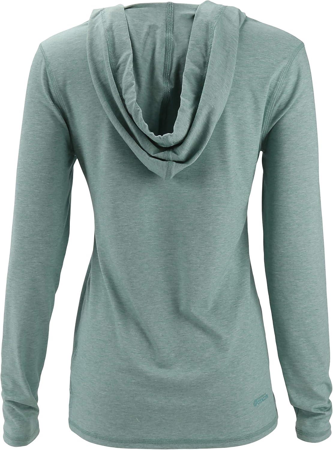 The EAG Elite Women's Light Weight Sunset Performance Sun Hoodie is powered by Coolcore technology and designed to keep you cool and comfortable in the summer heat. This ultra-light weight fabric technology offers industry leading thermoregulation, drying 45% faster, cooling 19% faster than the competition. The knit fabrication offers superior 4-way stretch to maximize mobility and comfort. Superior moisture wicking capabilities absorb sweat and other moisture into the fibers and disperses them throughout the shirt, getting rid of any wet spot sweat typically build up. This dispersion of moisture allows for superior breathability and faster drying, to keep you cool, comfortable, and dry. The EAG Elite Sunset V-Neck Sun Hoodie is engineered by women and made for the outdoors.